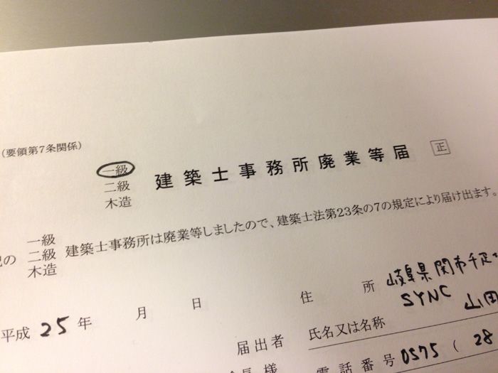 という事で、今日はエイプリルフール。個人事業主から法人に変更したので、建築事務所登録の書類上、「SYNC」を廃業して「株式会社SYNC」として新規登録しなくてはいけないのです。これからって時に廃業届を出さなくてはいけないのは、かなり複雑な気分。。