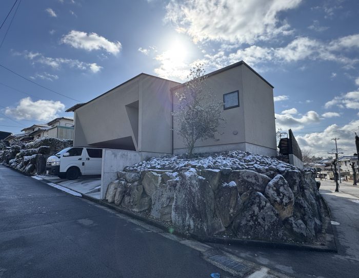 降水確率80%でしたが、なんとか降らず青空もちらりと。高低差を活かしつつ、団地内でもプライバシーと開放感を両立するプランとなっています。