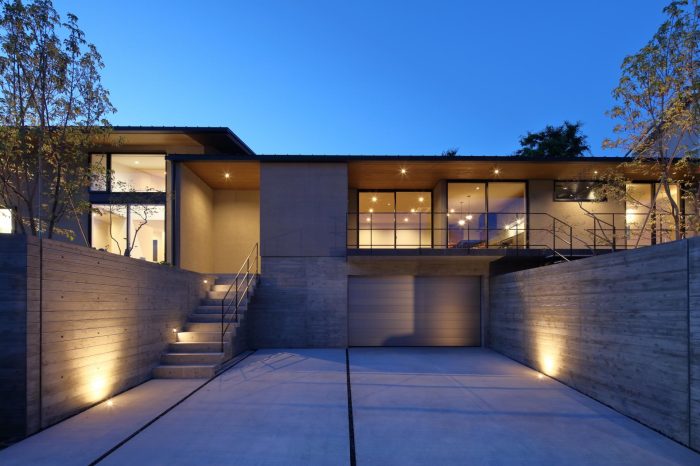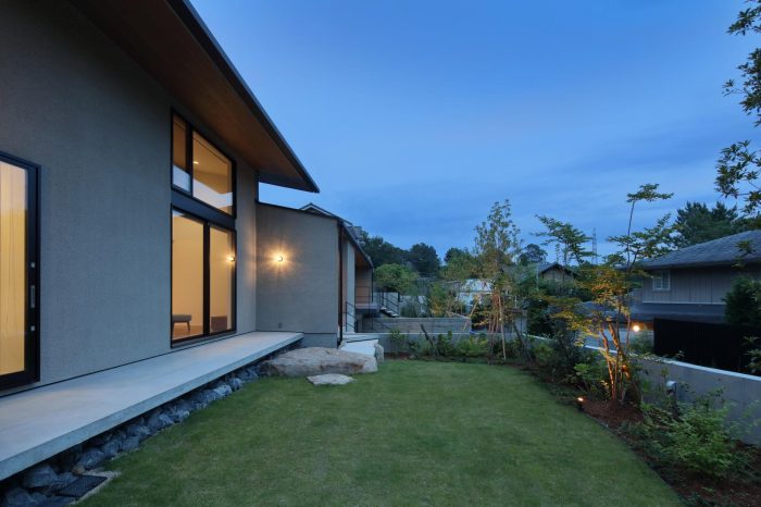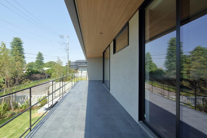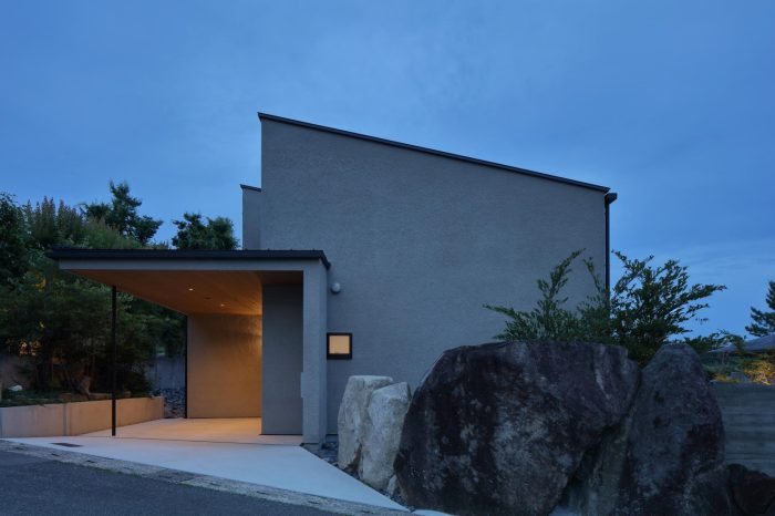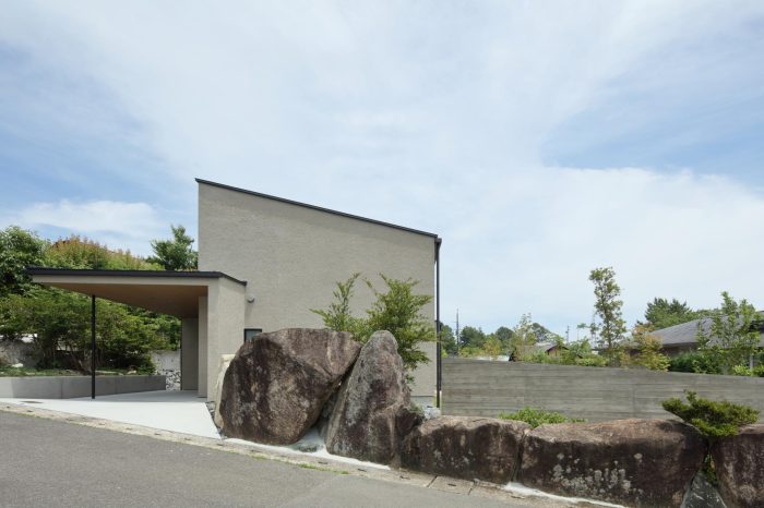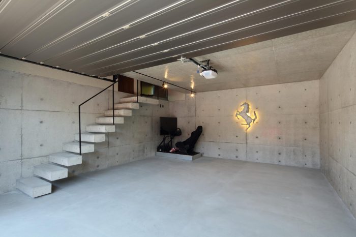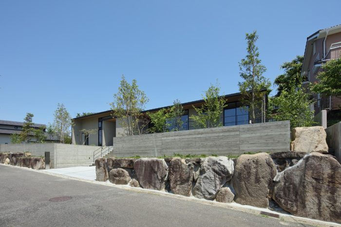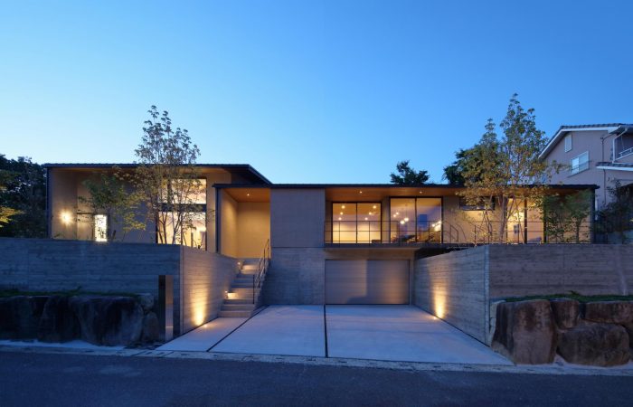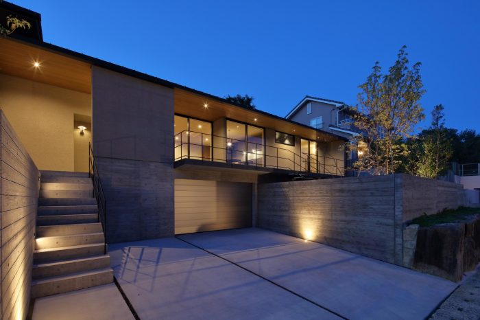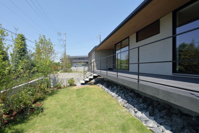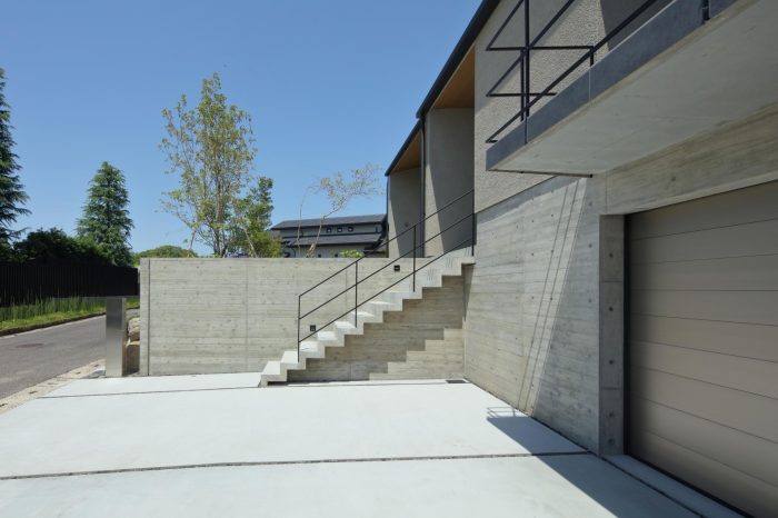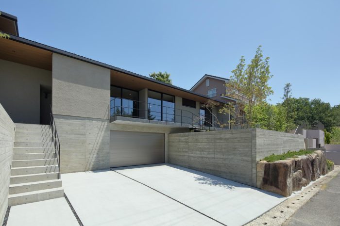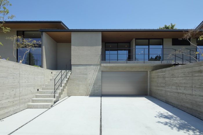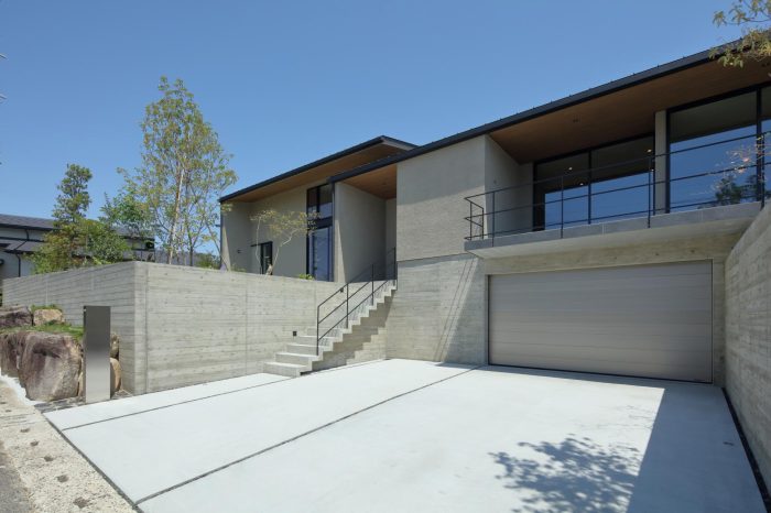 分譲地の2区画の間口を目一杯使い、高さを低く抑えたプロポーションがいい感じ。3台分のガレージがある贅沢仕様です。