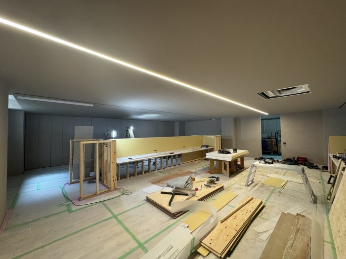 ショールームのオフィス部分の照明の試験点灯をしました。電球色のシームレスラインにベージュのサンドペイントとし、白い蛍光灯に白いビニールクロスというTHEオフィスではなく、住宅のように安らげる雰囲気にしました。